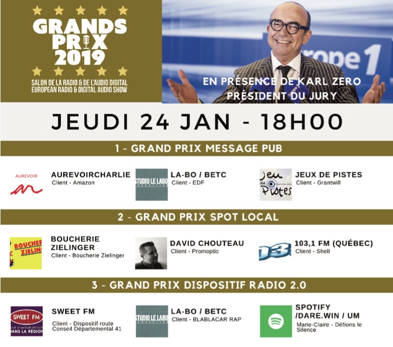 Jeudi 24 janvier 2019 à 18h, en direct du Salon de la Radio et de l’Audio Digital à la Grande Halle de La Villette, les membres du jury présidés par Karl Zéro, ont procédé à la remise des Grands Prix Radio 2019. Avec 14 catégories différentes, ces trophées, récompensent les professionnels les plus innovants et les plus créatifs en 2018 dans toutes les dimensions de la radio et de l’audio digital.