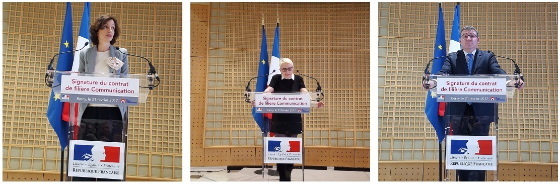 Le contrat de filière a été présenté par Madame Mercedes ERRA, préfiguratrice du comité de filière « La communication », à Madame Audrey AZOULAY, Ministre de la culture et de la communication et à Monsieur Christophe SIRUGUE, Secrétaire d’Etat chargé de l’industrie, lors de la cérémonie de signature du 21 février 2017.