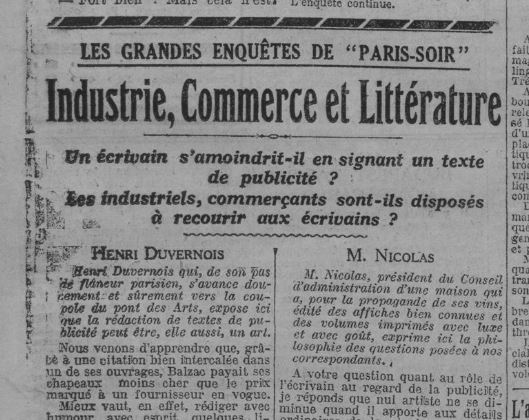 En 1927, à l’occasion de la création du « Prix Beaumarchais de Littérature publicitaire », une grande enquête « Littérature, commerce et industrie » a été publiée dans les colonnes du quotidien Paris-Soir, à laquelle ont participé de nombreux écrivains – Colette, Cendrars, Giraudoux… – ainsi que des industriels, commerçants et publicitaires de grandes firmes.