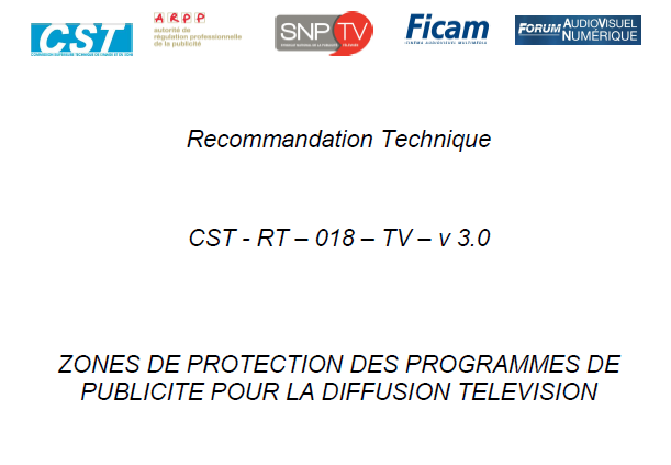 La recommandation de la Commission Supérieure Technique de l’image et du son CST RT 018 a été rédigée en 2008, à la demande du SNPTV (Syndicat National de la Publicité Télévisée) et de l’ARPP (Autorité de Régulation Professionnelle de la Publicité, ex-BVP) afin de guider les prestataires techniques dans la fabrication des programmes publicitaires lors du passage des programmes de publicité vers le format 16/9. Le Forum Audiovisuel Numérique (FAVN, ex-HDForum) et la Fédération des industries du Cinéma, de l’Audiovisuel et du Multimédia (Ficam) se sont associés à cette rédaction.