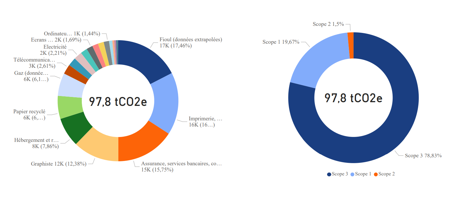 Sur 2021, la majorité des émissions de l’ARPP se situent sur les pôles suivants : énergie/consommation de fioul sur site (17,5 %), qui a basculé à compter de l’automne sur un chauffage collectif au gaz (6,1 %), imprimerie (16 %) et achats (15,75 %).