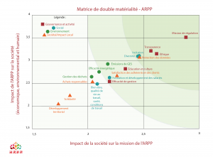 Accompagnée par Positive Company, l’ensemble des parties prenantes de l’ARPP a été interrogé afin de pondérer l’importance des enjeux préalablement identifiés par le Comité de pilotage RSE interne, et ce, au regard de deux matérialités :